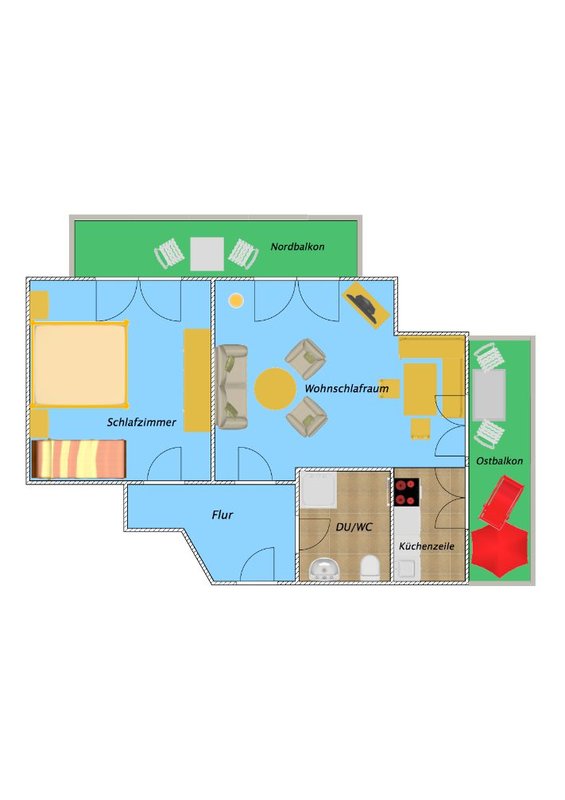 Große Ferienwohnung 50 qm mit Wohnraum, Schlafraum, Sat-TV, DU/WC und 2 große Balkone. Ideal für 2 Personen.